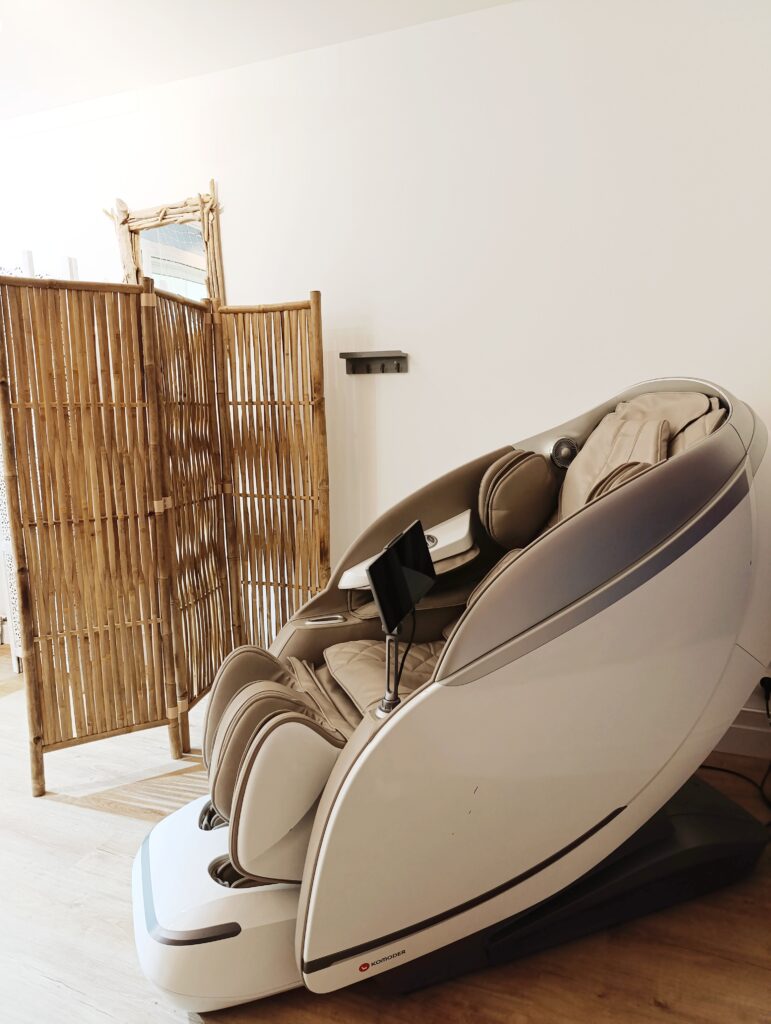 Le fauteuil de massage, disponible chez « L’EFFET ZEN GRAVITY » à La Palmyre, offre une alternative moderne et technologique au massage traditionnel effectué par un professionnel. Ce dispositif utilise divers systèmes mécaniques pour simuler les techniques de massage comme le pétrissage, le tapotement et le roulement. Cette option permet aux clients de bénéficier d’un massage à tout moment sans nécessiter la présence d’un masseur.