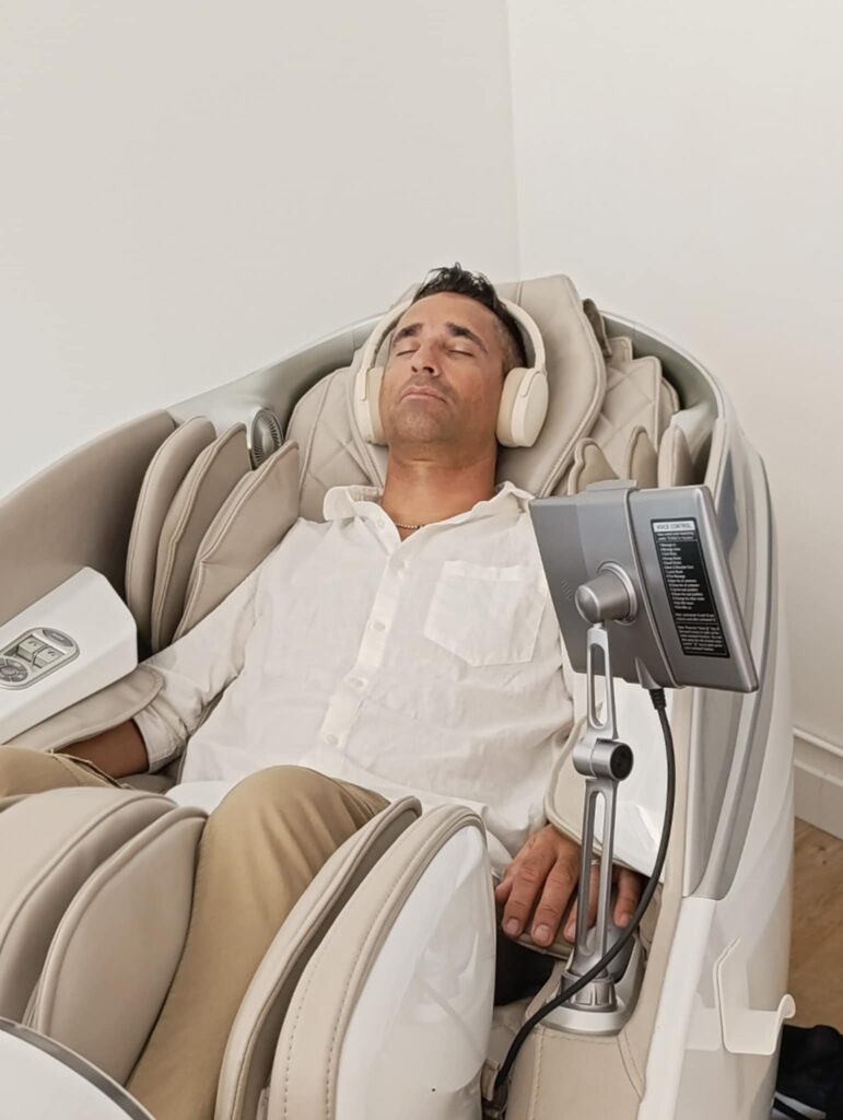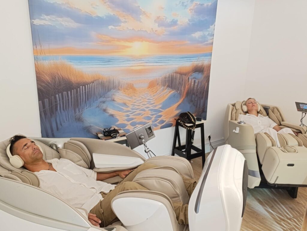 Nos fauteuils de massage s’inspirent du savoir-faire japonais, reconnu pour son approche précise et respectueuse du corps. Chaque fauteuil combine différentes techniques traditionnelles de massages pour vous offrir une relaxation complète et naturelle : pétrissages, shiatsu, pression d’air, étirements et vibrations, visant à détendre en profondeur les muscles et apaiser les tensions. C’est cette combinaison de technologie et de confort absolu qui nous amène à parler de « Massage en Apesanteur », une parenthèse douce et enveloppante, qui agit aussi bien sur le corps que sur l’esprit. Une expérience immersive accessible à tous, lancer à la Palmyre puis étendu à Royan après les retours pleinement satisfaisants.