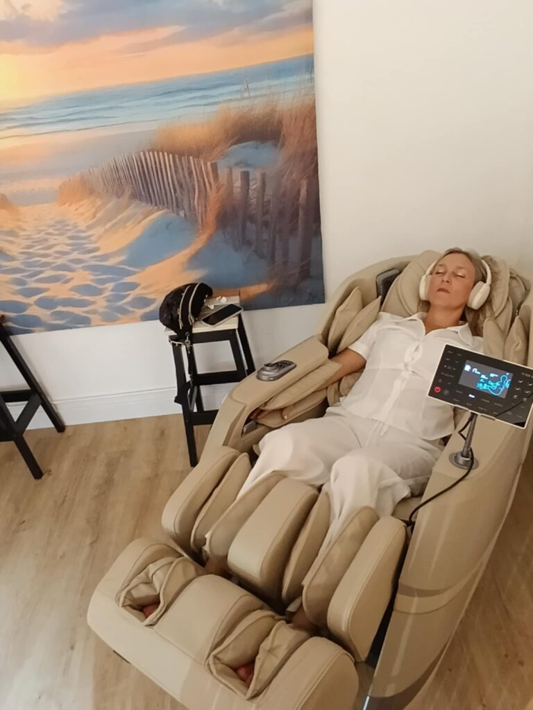 Le fauteuil, tel un cocon, enveloppe et épouse votre corps. Doté d’un système chauffant pour détendre les muscles en profondeur et d’un fond sonore doux, il offre une relaxation intense de la tête aux pieds. Chaque séance est personnalisable selon vos besoins.